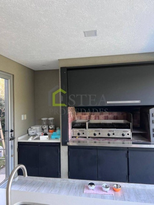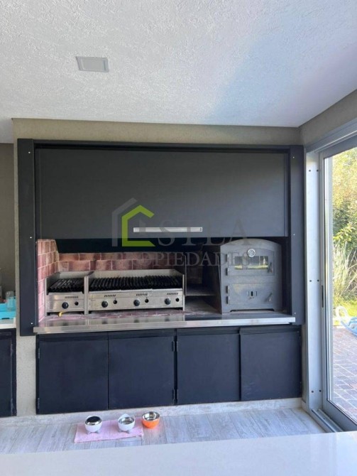 -Parrilla completa, parrigas, horno para pizzas marca Tromen, isla y espacio de guardado.