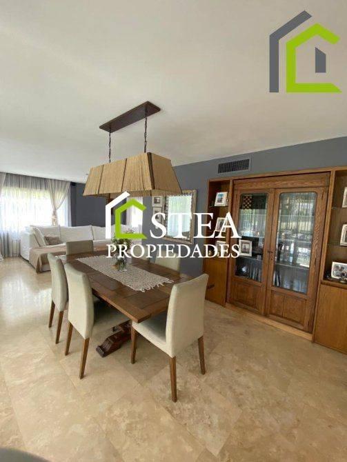 Elegante living-comedor con amplios ventanales y vista al parque.
